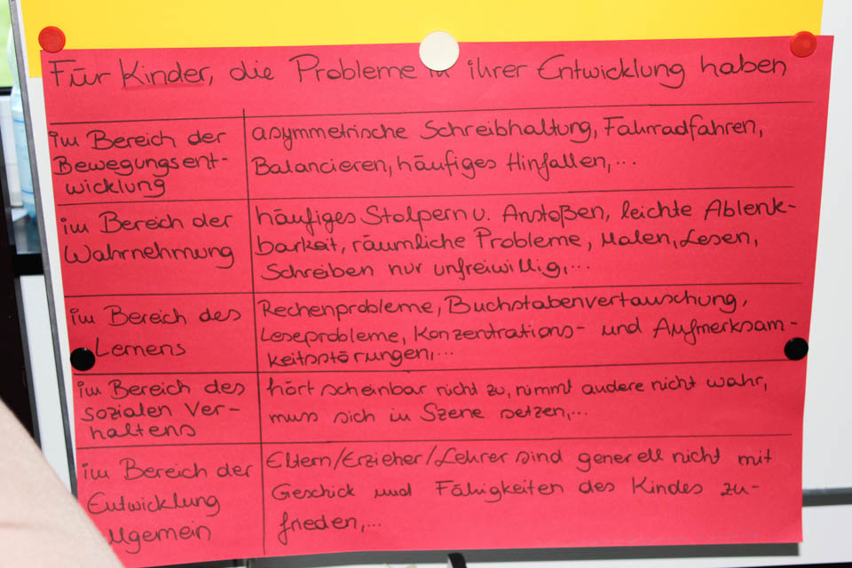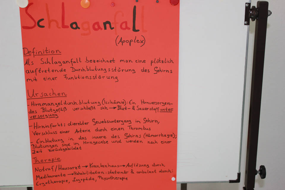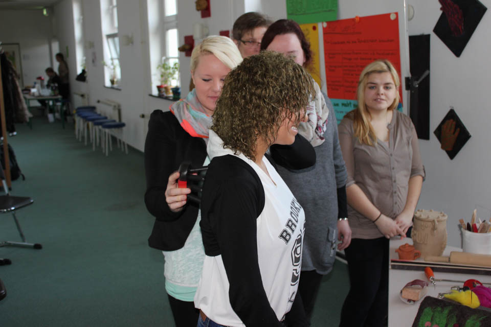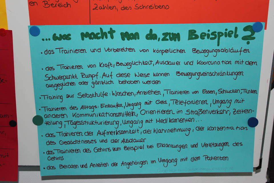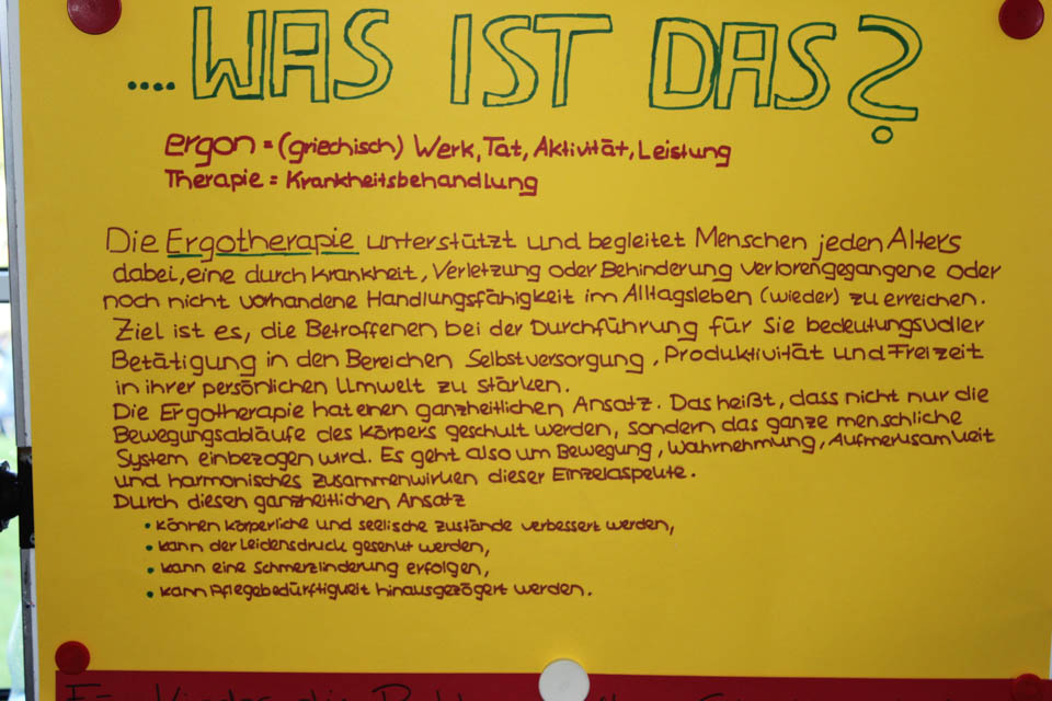 Wir haben sehr viele Informationen bekommen, alle Fragen wurden uns beantwortet. Die Ergotherapeuten haben in verschiedenen Räumen mögliche Bereiche vorgestellt und erklärt, an denen wir dann eigenhändig ausprobieren konnten, was in der Ergotherapie alles gemacht werden kann, z.B. autogenes Training, basteln, Gedächtnistraining, Tastsinn Übungen….