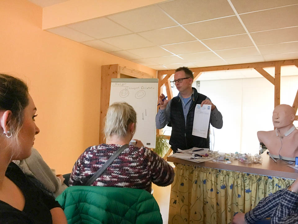 Nach der Begrüßung durch den Kfm. Direktor HerrnEnnenbach, bekamen die Auszubildenden einen Überblick über den ambulanten Intensiv-Pflegedienst von Herrn Oliveira. Es war eine „neue“ Welt, welche sich somit den Auszubildenden öffnete. Die „WG“ verfügt über 12 Plätze für langzeitbeatmete Bewohner u.a. auch für Wachkomapatienten. Pro Schicht arbeiten jeweils drei Pflegefachkräfte, da die intensivmedizinische Pflege auch viel Zeit in Anspruch nimmt. Anschließend bekamen die Auszubildenden jeweils in zwei Gruppen die Möglichkeit, die Versorgung eines Tracheostomas durch die Firma Heimomed praxisnah erklärt zu bekommen. Auch konnten sie ihr theoretisches Hintergrundwissen durch die Firma Resmed zum Thema Lunge repetieren und die Besonderheiten der außerklinischen Beatmung kennen lernen. Somit bot sich den Auszubildenden eine ganz andere Form eines praxisnahen und lernfeldübergreifenden Unterrichts.